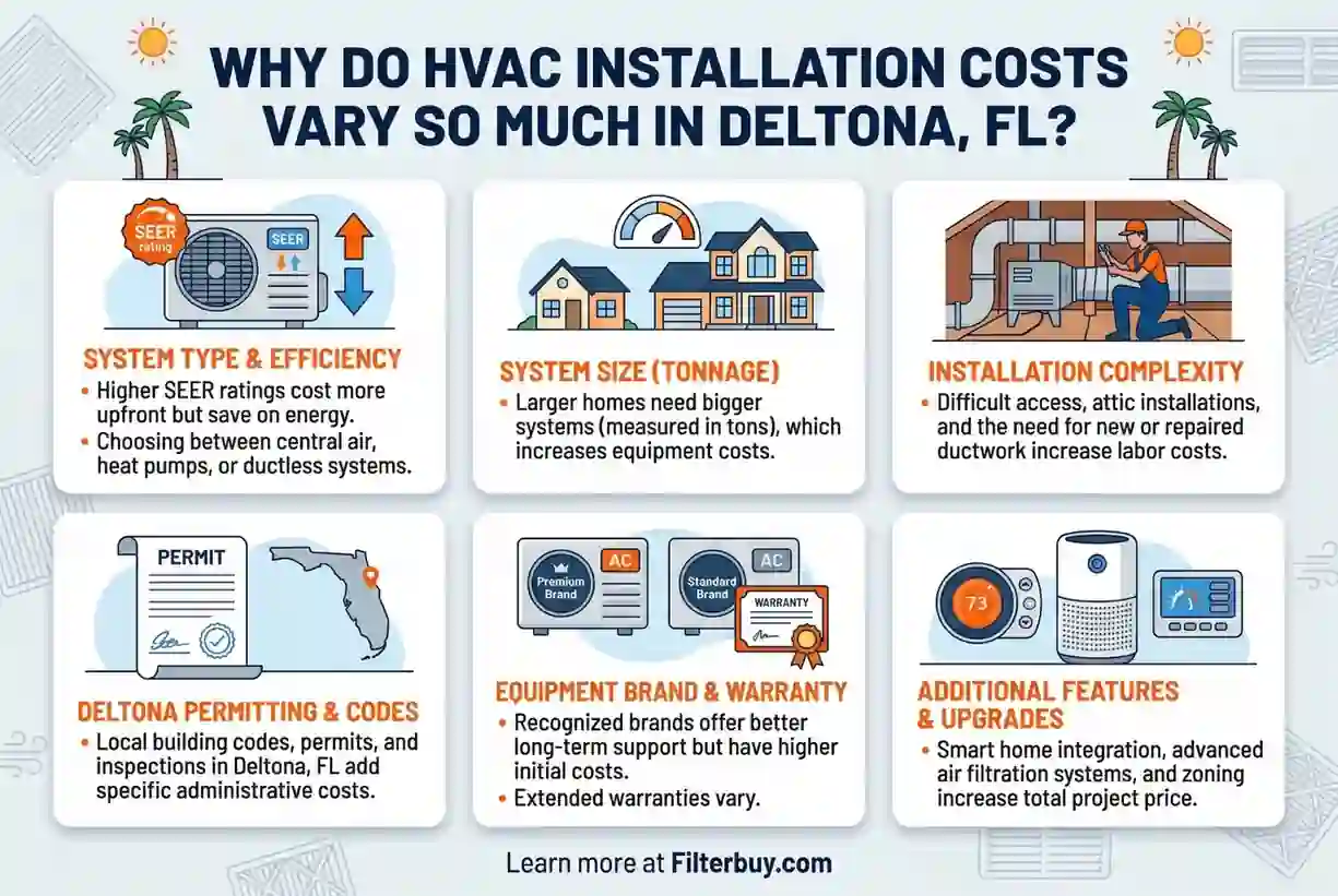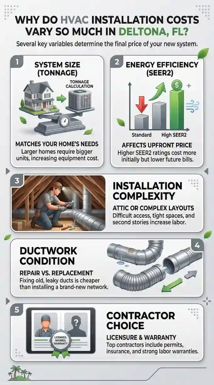 Deltona's mix of aging 1980s and 90s-era construction, high seasonal humidity, and homes with undersized or deteriorating ductwork means no two installs pull from the same cost variables. From what we've seen on the job, the system type, duct condition, and home layout do more to shape your final number than most contractors will tell you upfront.